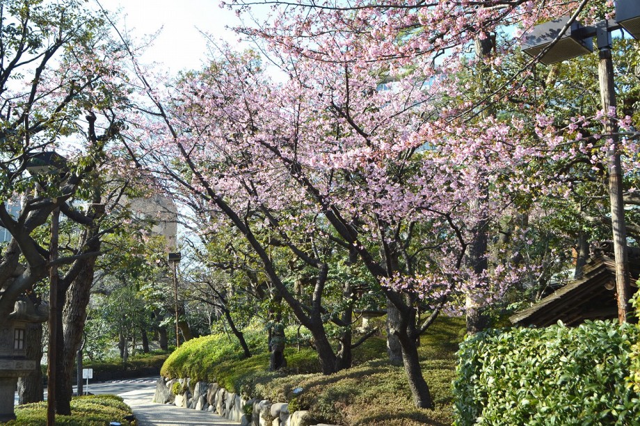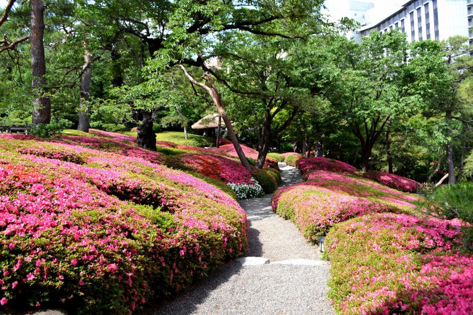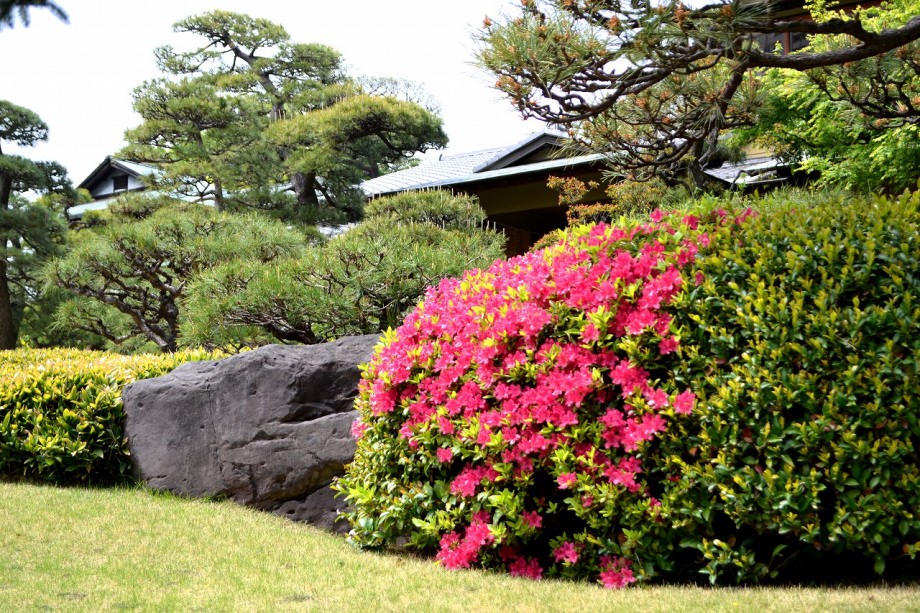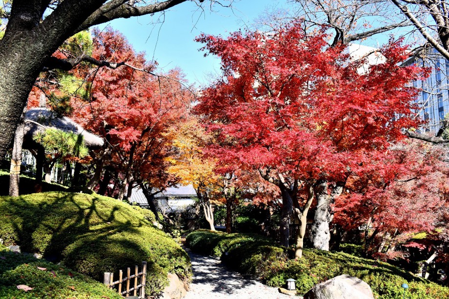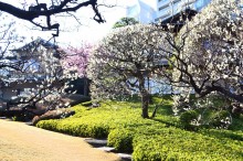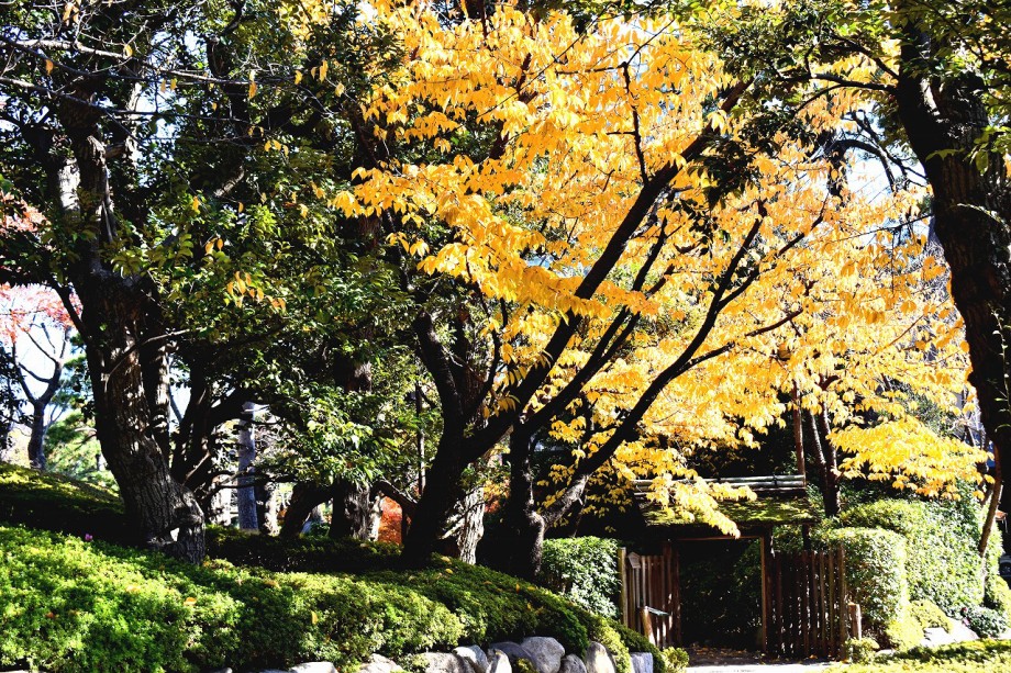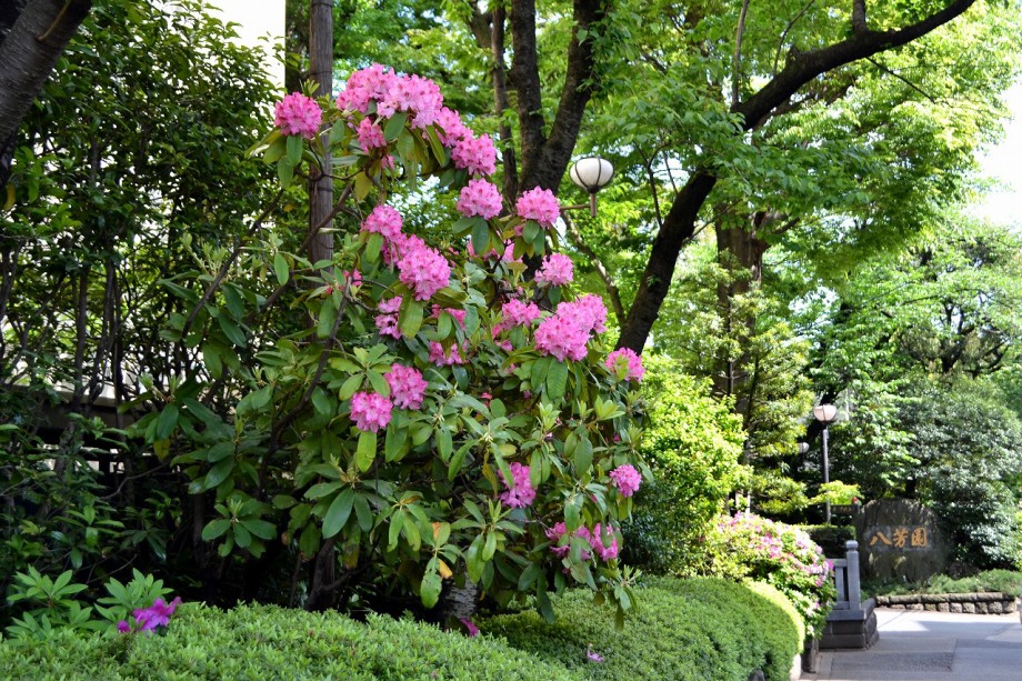 庭園には2月になると紅梅と河津桜が咲きます。4月には大きな桜の木に花が咲き、庭園に映えて見事です。桜の花には鳥がたくさん飛んできます。 5月にはたくさんのツツジの花が咲き庭園一面が真っ赤に染まり迫力があります。6月になると庭園の新緑が綺麗になります。8月には百日紅が咲きます。 11月にはモミジが紅葉し始めます。八芳園のモミジは黄色いモミジが色が鮮やかで綺麗です。池に映る紅葉も風情があります。