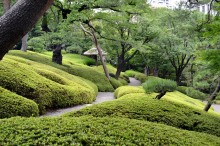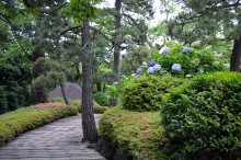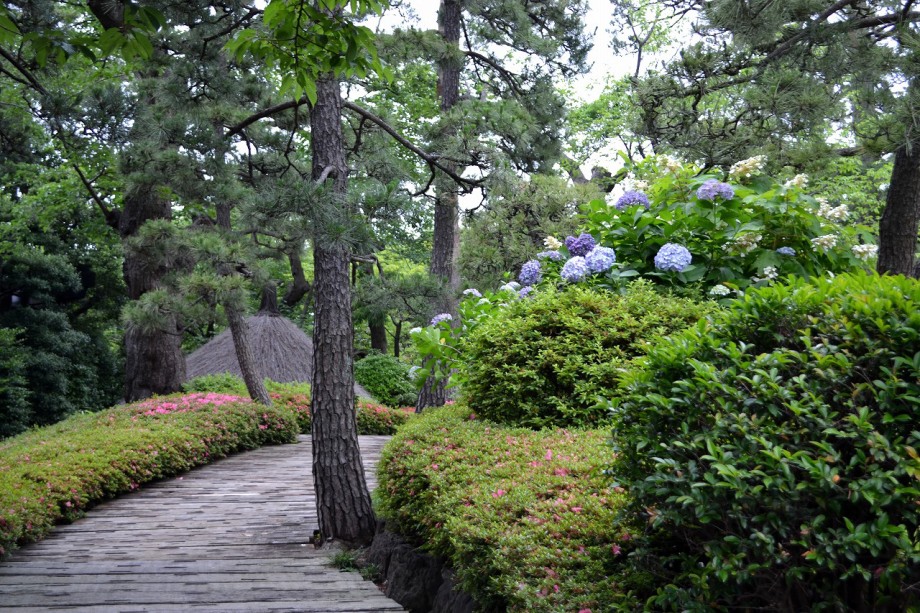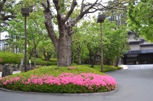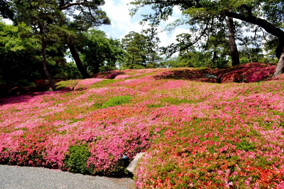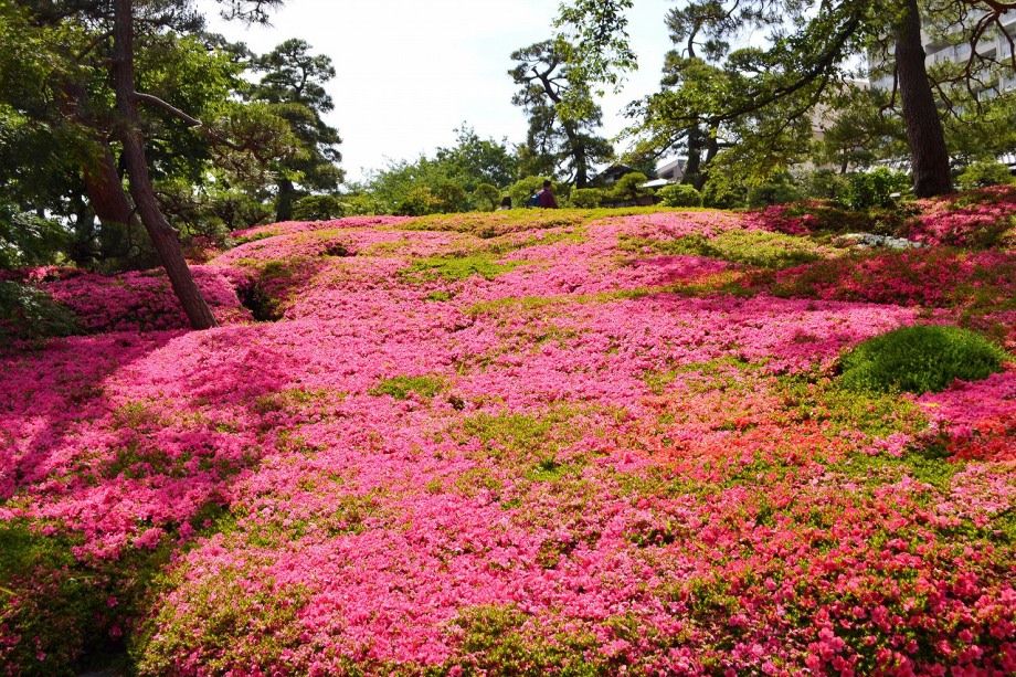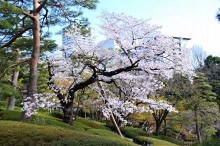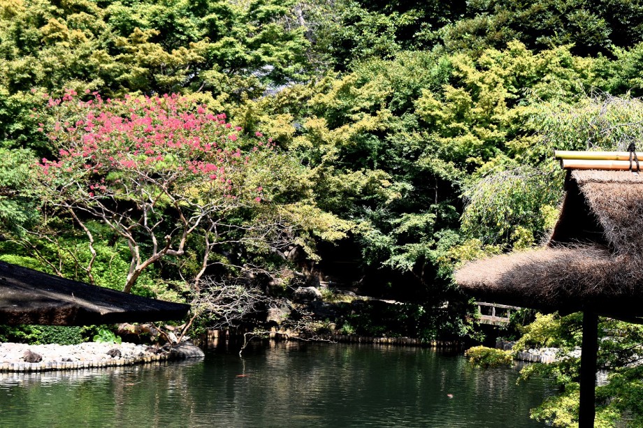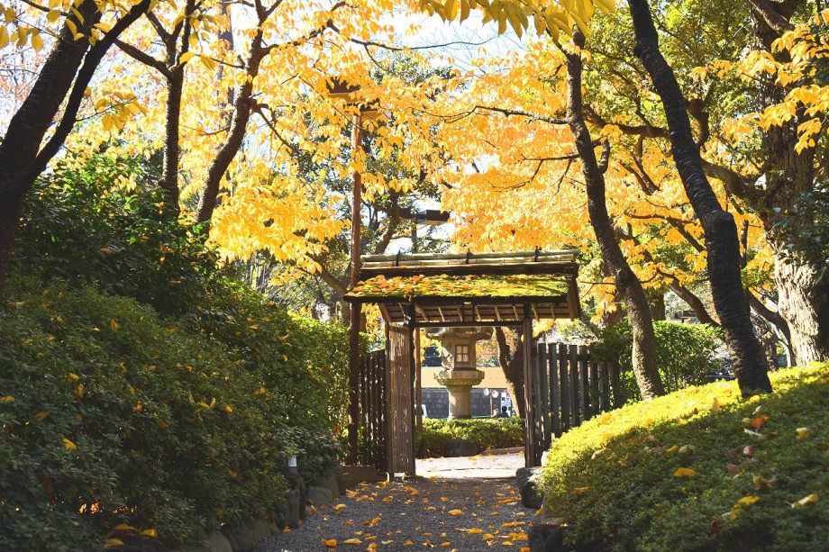 庭園には2月になると紅梅と河津桜が咲きます。4月には大きな桜の木に花が咲き、庭園に映えて見事です。桜の花には鳥がたくさん飛んできます。 5月にはたくさんのツツジの花が咲き庭園一面が真っ赤に染まり迫力があります。6月になると庭園の新緑が綺麗になります。8月には百日紅が咲きます。 11月にはモミジが紅葉し始めます。八芳園のモミジは黄色いモミジが色が鮮やかで綺麗です。池に映る紅葉も風情があります。